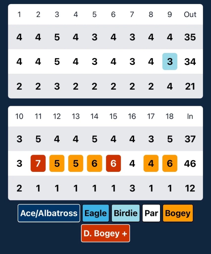 Mix of amazing and terrible, the tail of two nines. Front 9 I was one under par gross (21 points) through the 9 in 35-40 knots winds. Our front 9 is a little more protected from the winds so whilst it impacts shots, the winds weren’t impact pitches and putts as much. The irons were doing what I wanted. I’d aim left side of the green for the wind to bring it back and like clockwork, it would end up 10 foot from the pin. I missed 3 additional 10 foot birdies, so whilst it was was a really good 9, I still left a lot of shots out there.