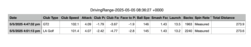 This pretty much supports my comments on the distances being comparable between the GT2 TPT and the LA Golf Gold Shaft